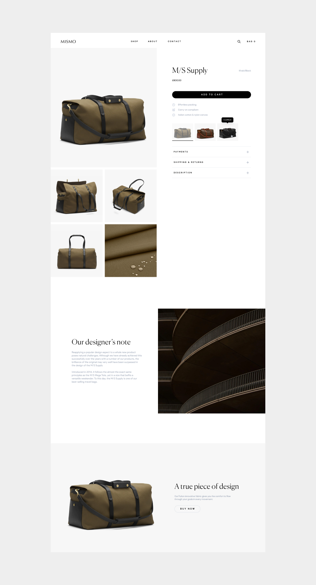 As lead designer and developer, I created a concept redesign of Mismo’s e-commerce website to reflect their minimalist aesthetic and commitment to quality. From concept to delivery, I crafted a user-focused digital experience that brought the brand’s values to life through refined layouts, elegant typography and responsive design. I designed immersive product pages that told the story behind each item, while ensuring a seamless checkout journey across all devices. Special attention was given to mobile usability, optimising touch interactions and responsiveness to meet the needs of modern, style-conscious shoppers.